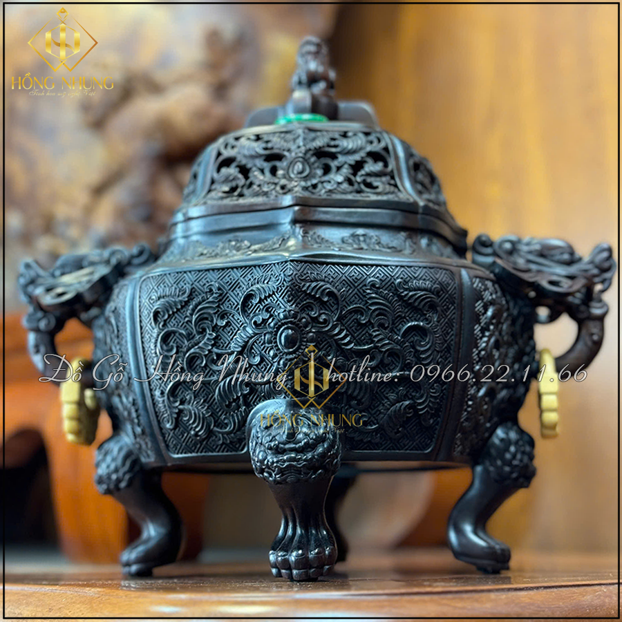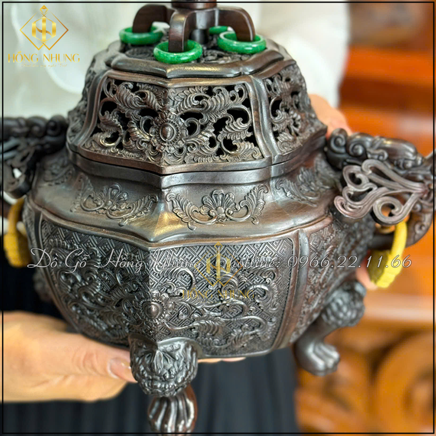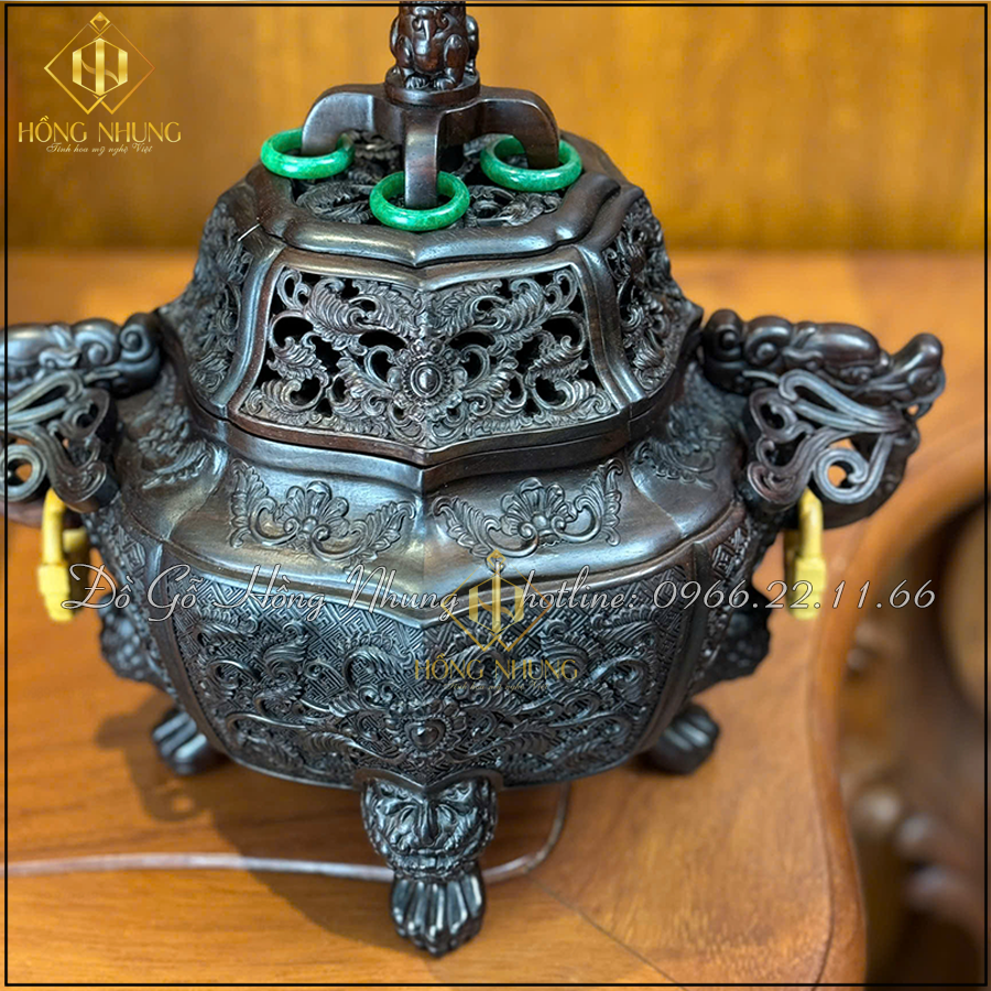 Sự kết hợp tinh tế giữa lân – rồng – hoa văn cổ khiến chiếc lư đốt trầm gỗ trắc để phòng trà trở thành biểu tượng của bình an – quyền uy – thanh tịnh.